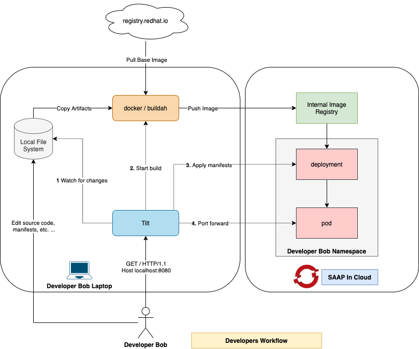 - After a change has been detected, Tilt executes docker/buildah to update the container image. After the build completes, the updated container image is pushed to the internal docker registry.
