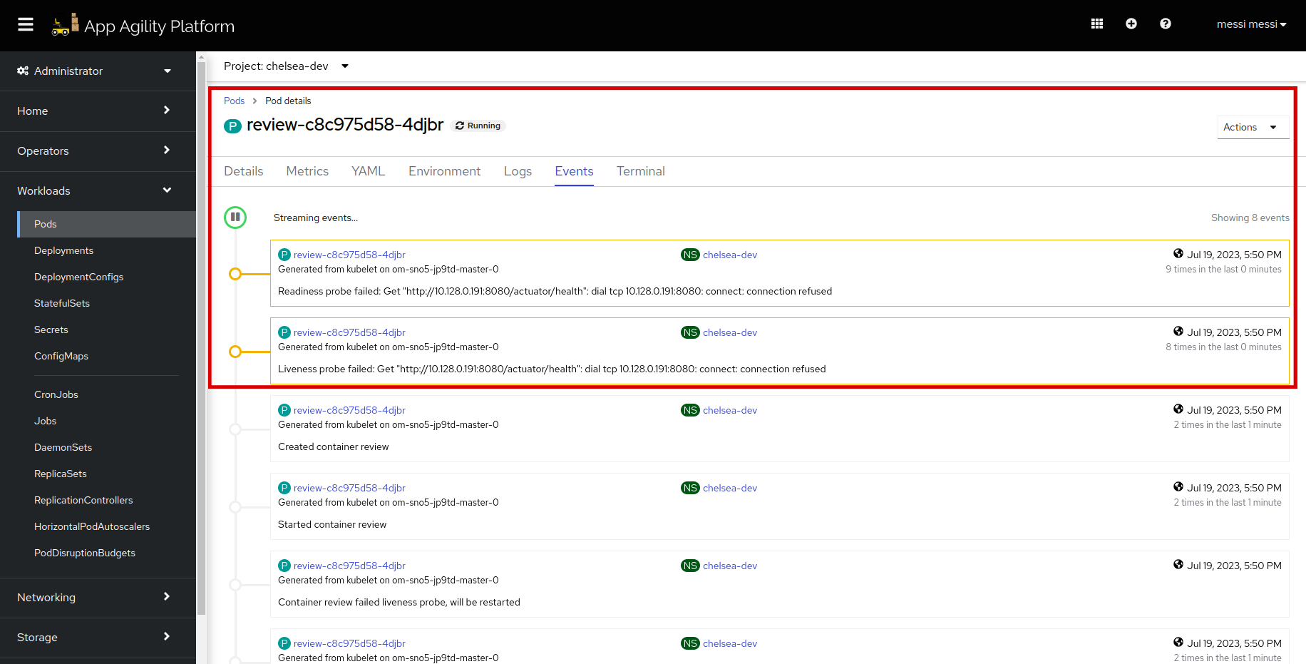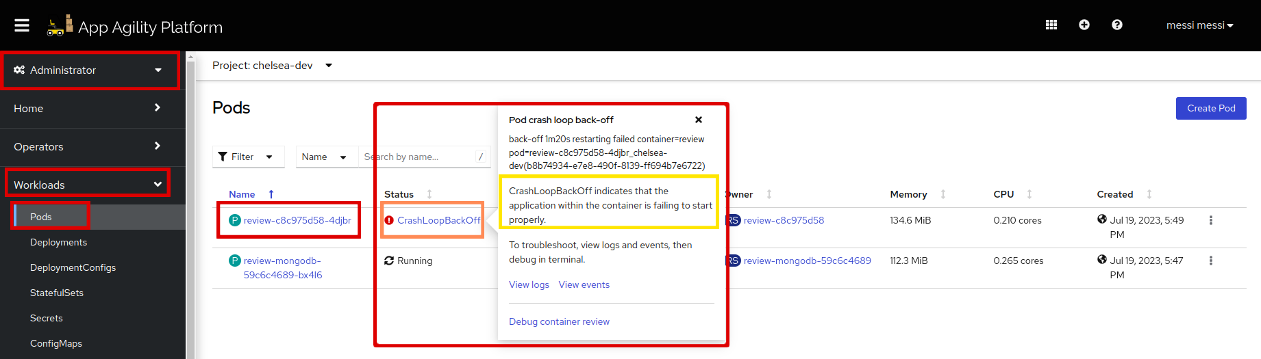 The pod status shows CrashLoopBackOff. Let's see pod's events for more detailed logs: