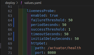 deploy/values.yaml. Liveness probes continuously monitor the health of containers and automatically restart any instances that fail the health check.# Liveness Probe Configuration livenessProbe: # Enable liveness probe for the container enabled: true # Number of consecutive failures to consider the container as unhealthy failureThreshold: 50 # Interval at which the liveness probe will be performed periodSeconds: 50 # Number of consecutive successes required to consider the container as healthy again successThreshold: 1 # Maximum time the probe can take before it is considered failed timeoutSeconds: 50 # Initial delay before the first liveness probe is performed initialDelaySeconds: 50 # http GET request used for the liveness probe httpGet: # Path for the health check endpoint path: /actuator/health # Port number where the health check endpoint is exposed port: 8080Note
