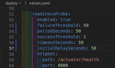 deploy/values.yaml. Readiness probes determine if a container is ready to serve traffic and delay routing until the container is ready.# Readiness Probe Configuration readinessProbe: # Enable readiness probe for the container enabled: true # Number of consecutive failures to consider the container as not ready failureThreshold: 50 # Interval at which the readiness probe will be performed periodSeconds: 50 # Number of consecutive successes required to consider the container as ready successThreshold: 1 # Maximum time the probe can take before it is considered failed timeoutSeconds: 50 # Initial delay before the first readiness probe is performed initialDelaySeconds: 50 # http GET request used for the readiness probe httpGet: # Path for the health check endpoint path: /actuator/health # Port number where the health check endpoint is exposed port: 8080Note