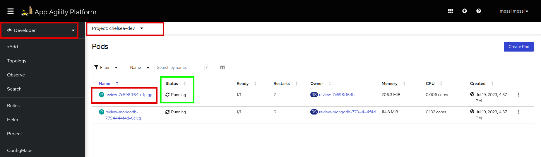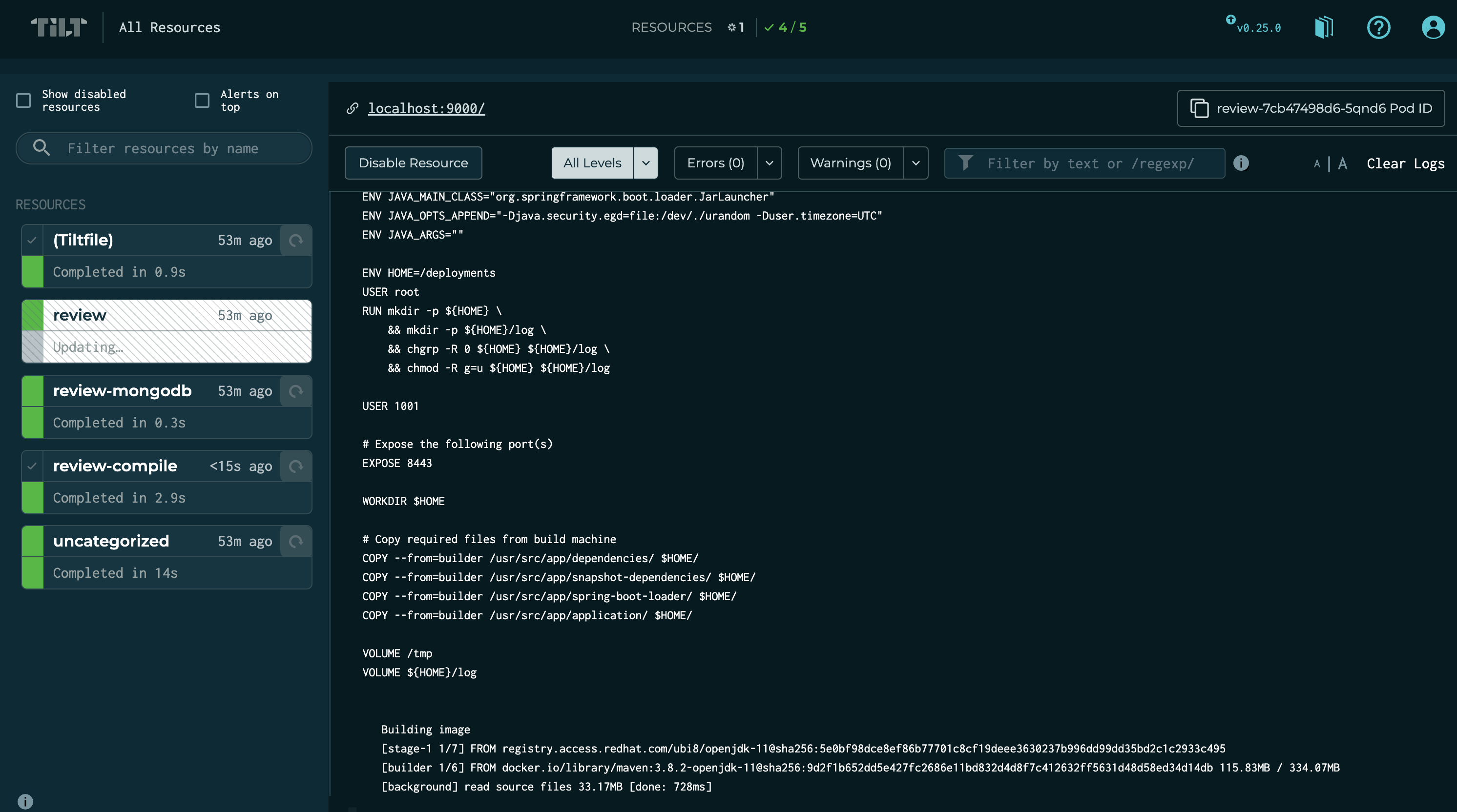 values.yamland runtilt upat the root of your directory. Press the space key to view the progress in Tilt web UI. The application should be running in the namespace used intilt_options.jsonfile. -
