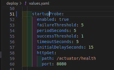deploy/values.yaml. Startup probe is specifically designed to check if an application has completed its initialization and is fully ready to serve traffic.# Startup Probe Configuration startupProbe: # Enable the startup probe for the container enabled: true # Number of consecutive failures to consider the startup as unsuccessful failureThreshold: 5 # Interval at which the startup probe will be performed periodSeconds: 5 # Number of consecutive successes required to consider the startup as successful successThreshold: 1 # Timeout for the startup probe timeoutSeconds: 5 # Delay before the first startup probe is performed initialDelaySeconds: 5 # http GET request used for the startup probe httpGet: # Path for the startup check endpoint path: /actuator/health # Port number where the startup check endpoint is exposed port: 8080Note