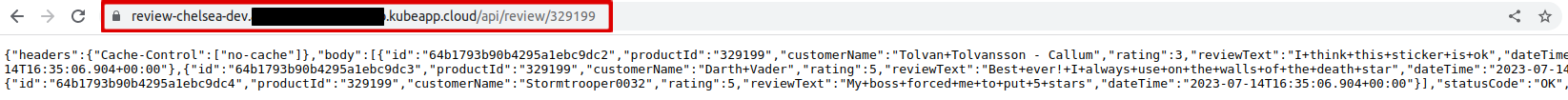 /api/review/329199Now you can access the application externally with this route.