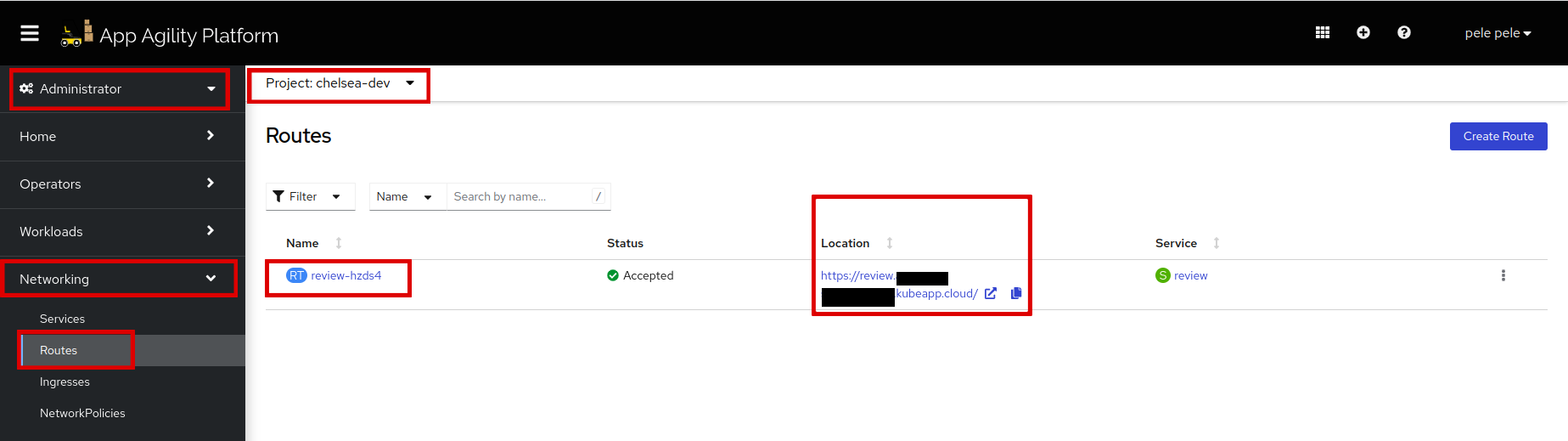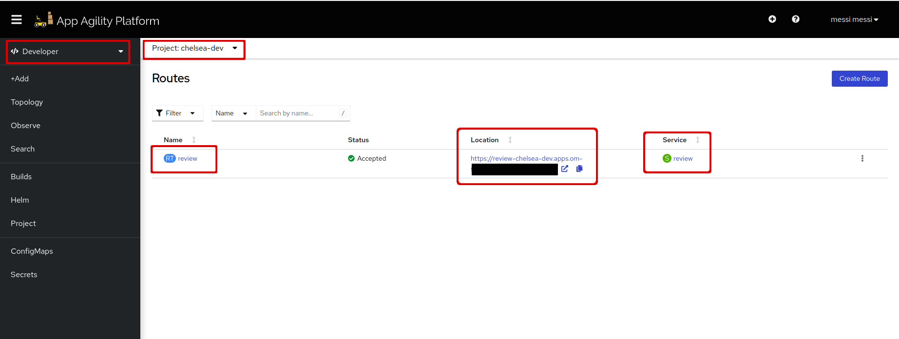 Here you can see the route and the service that is associated with it.