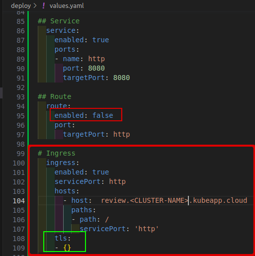 deploy/values.yamlfile, define ingress:## Ingress ingress: enabled: true # Enables the creation of an Ingress resource on SAAP servicePort: http # Specifies the service port to use for routing traffic hosts: # Defines the list of hosts to route traffic to - host: review.<CLUSTER-NAME>.kubeapp.cloud # define a list of hosts paths: - path: / # Specifies the path for incoming traffic servicePort: 'http' # Specifies the service name to forward traffic to tls: - {} # Configures TLS settings for the Ingress resource, using the default ingress-controller certificateNote