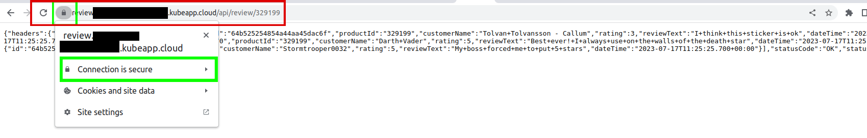 /api/review/329199at the end of the route.The lock sign shows that the connection of this route is secure. Now you can access the application externally exposed via