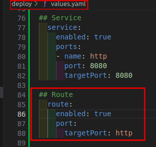 deploy/values.yamlfile, define a route:## Route route: enabled: true # Enables the creation of a Route resource on SAAP port: targetPort: http # Specifies the target service port nameIt should look like this: