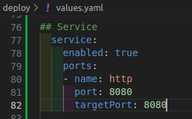 deploy/values.yamlfile, define a service:## Service service: enabled: true # Enables the creation of a Service resource on SAAP ports: - name: http # Specifies the name of the service port: 8080 # Specifies the port on which the service will listen targetPort: 8080 # Specifies the port on the container/application to which the traffic will be forwardedIt should look like this: