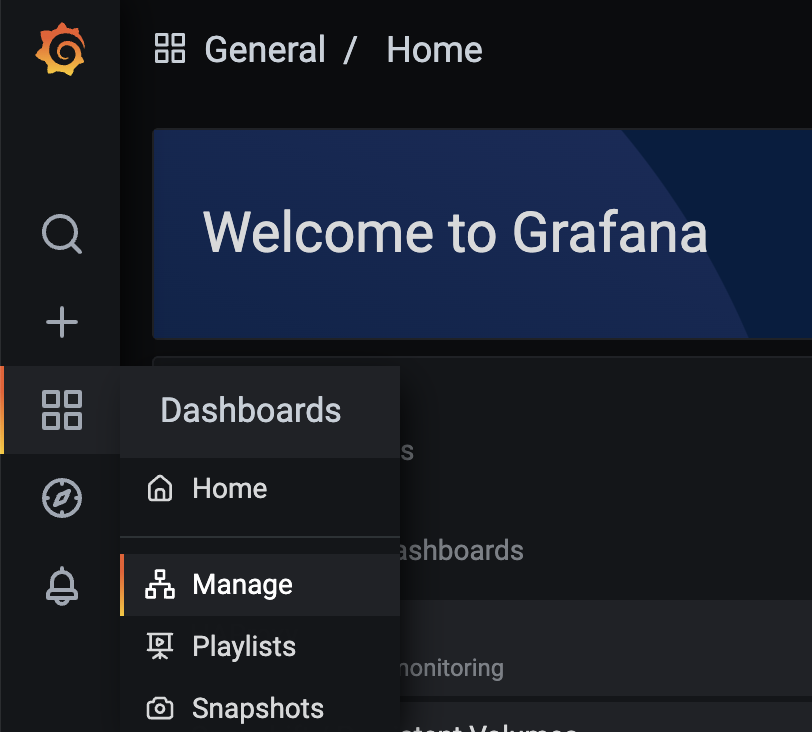 Open Grafana web UI, and go to [Dashboards]->[Manage] to view Dashboards management page