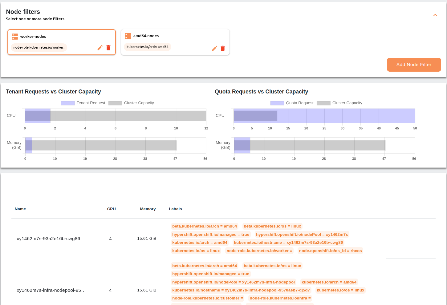This section displays bar charts that compare the current resource requests from tenants (like CPU and memory) with the total available cluster capacity. The charts visually represent how much of the cluster’s resources are currently being utilized versus what is available, helping identify over-utilization or under-utilization scenarios.