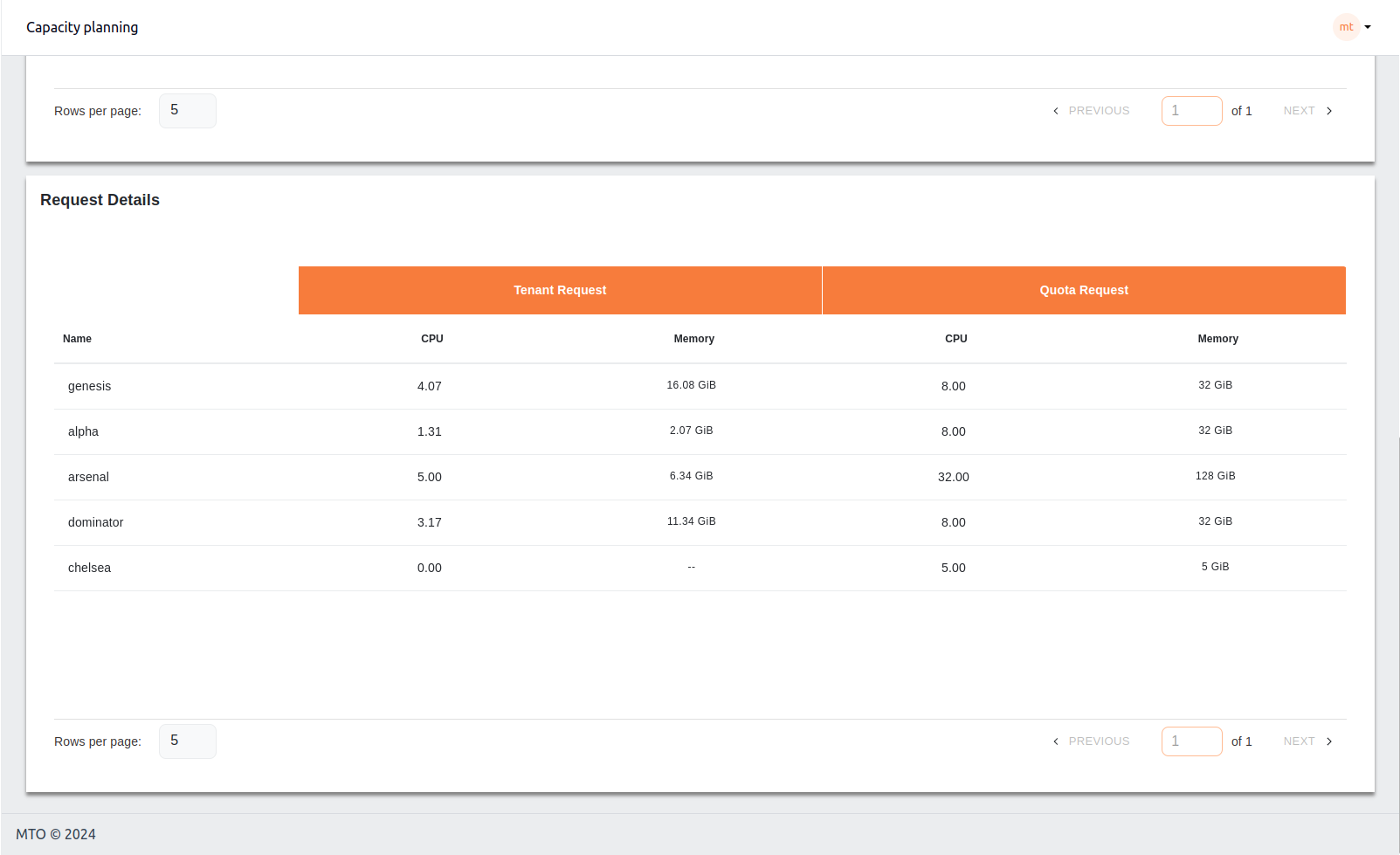 This table provides a breakdown of the resource requests from different tenants, displaying both the requested resources (CPU and memory) and the allocated quotas. It helps to monitor if tenant requests align with the quotas set for each tenant, ensuring optimal resource management.