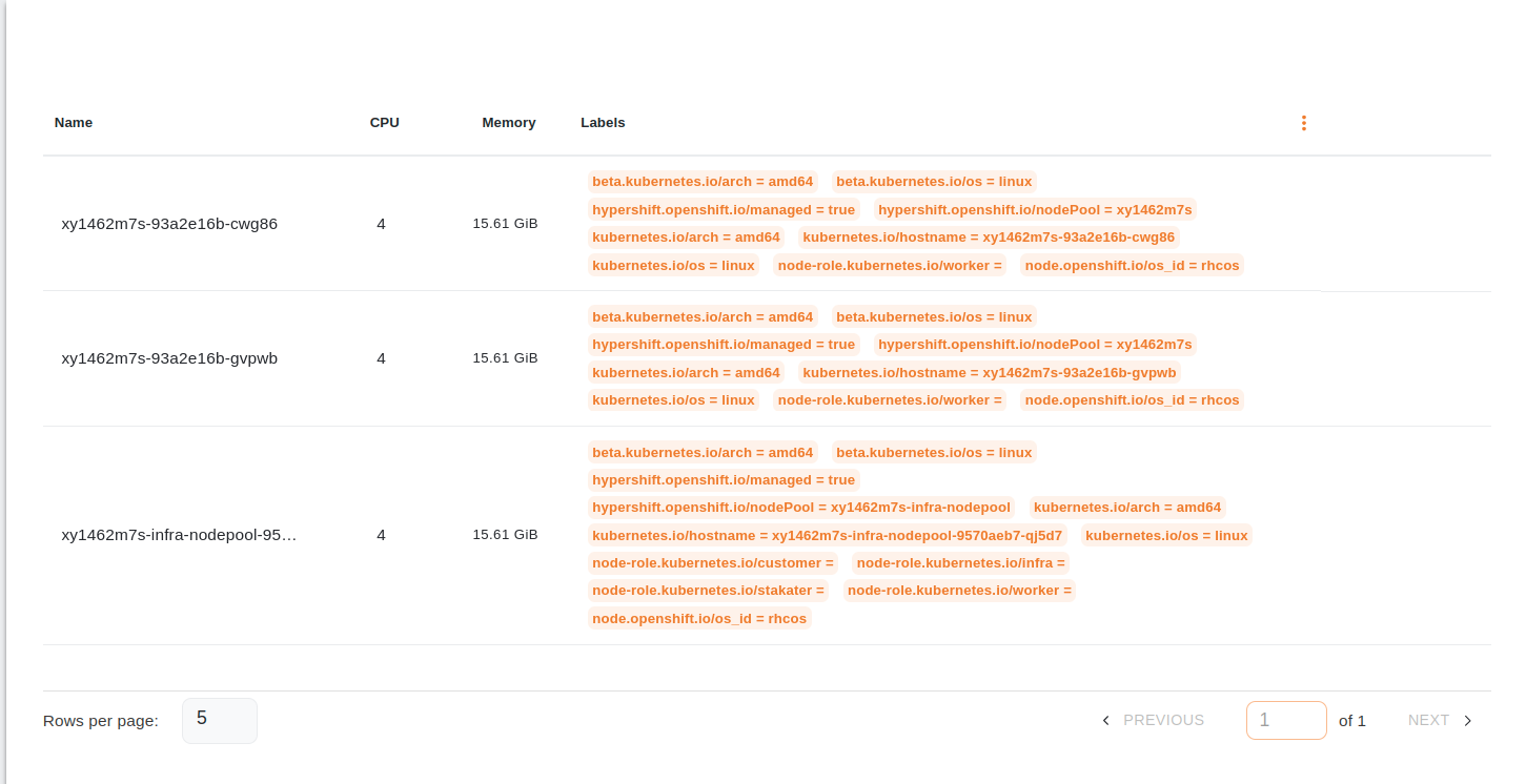 A detailed table lists the worker nodes in the cluster, displaying each node’s CPU and memory capacity along with various labels that indicate the node’s configuration and role (e.g., worker, infra). This information helps in identifying resource distribution across nodes and managing workloads accordingly.