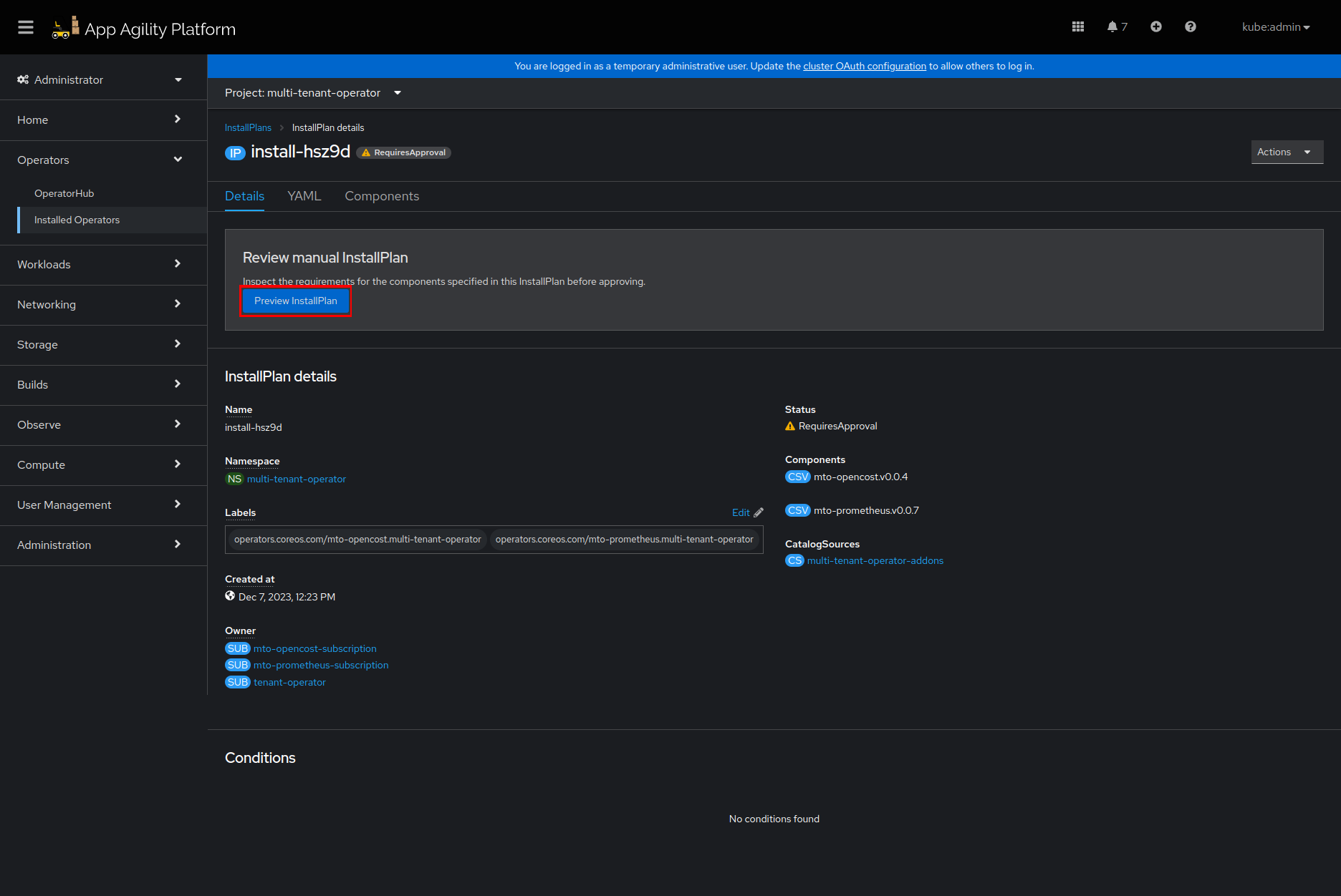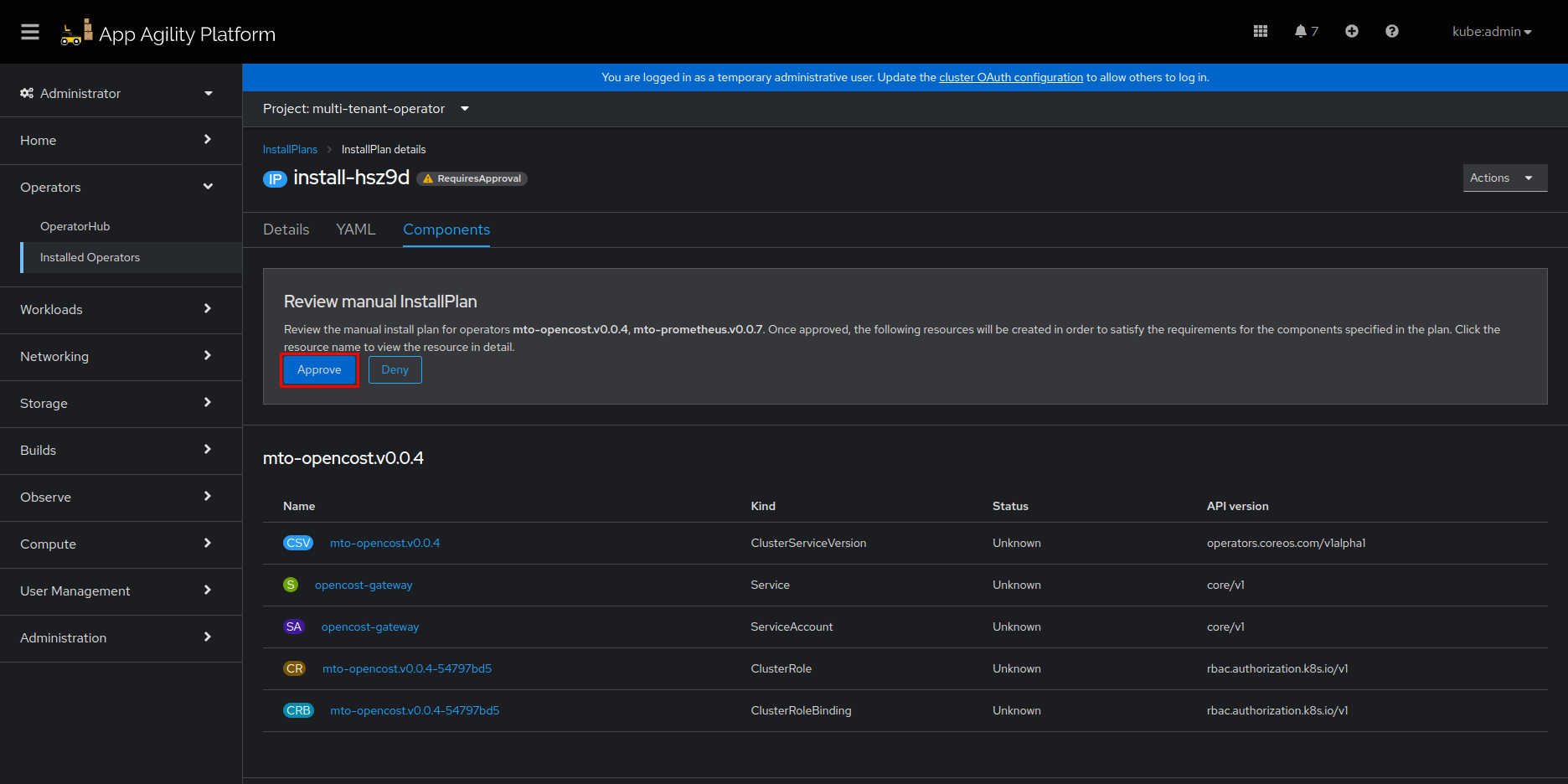 InstallPlanwill be approved, and MTO console components will be installed.