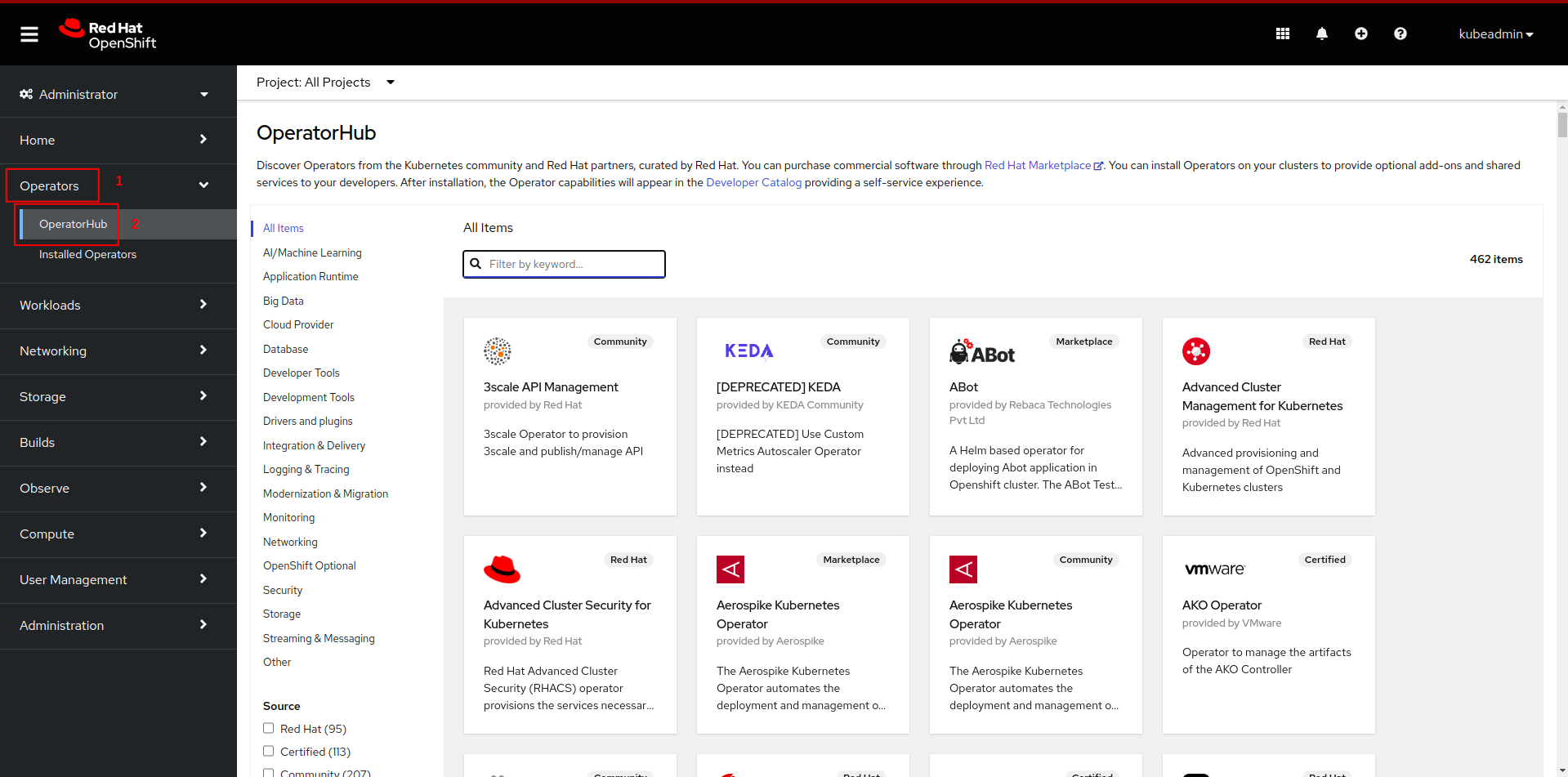 Operators, followed byOperatorHubfrom the side menu