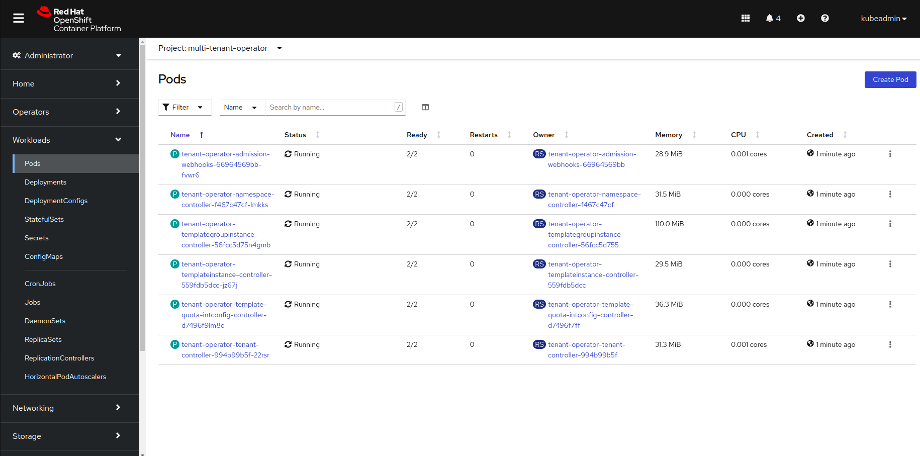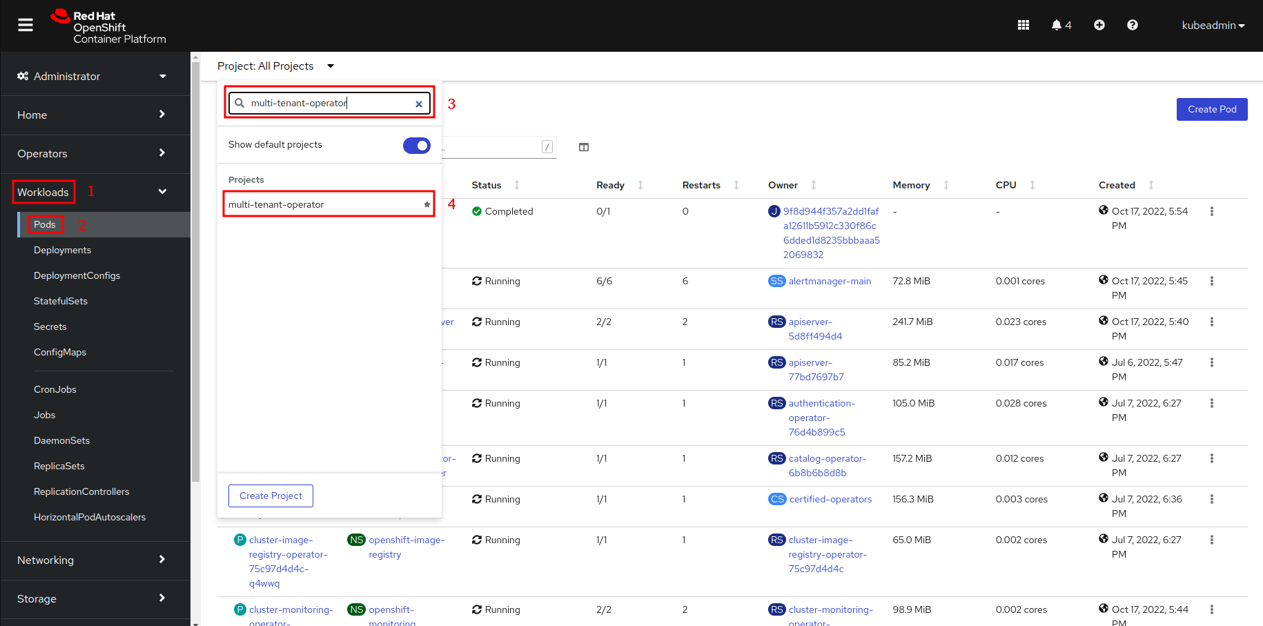 Workloads, followed byPodsfrom the side menu and selectmulti-tenant-operatorproject