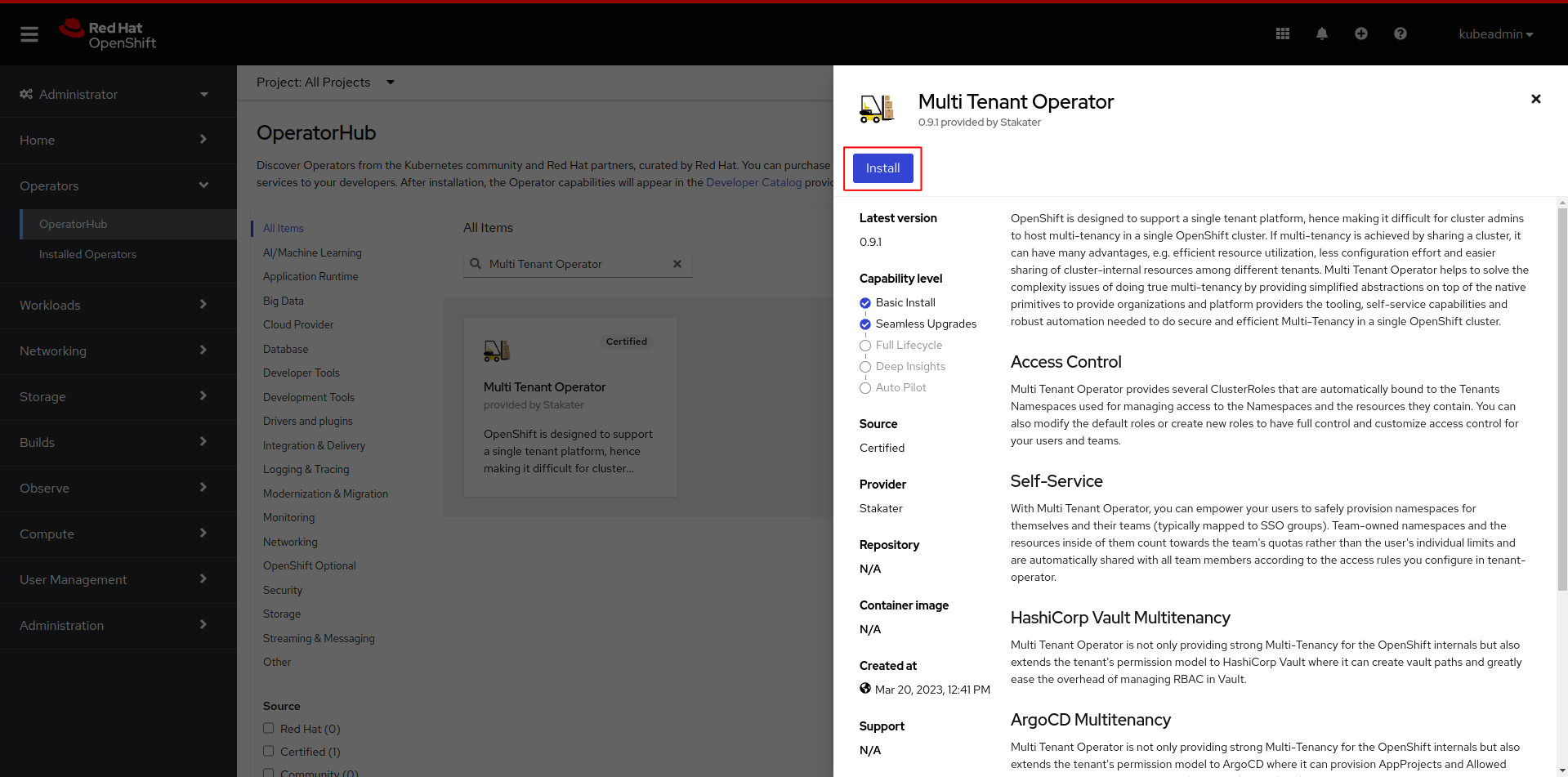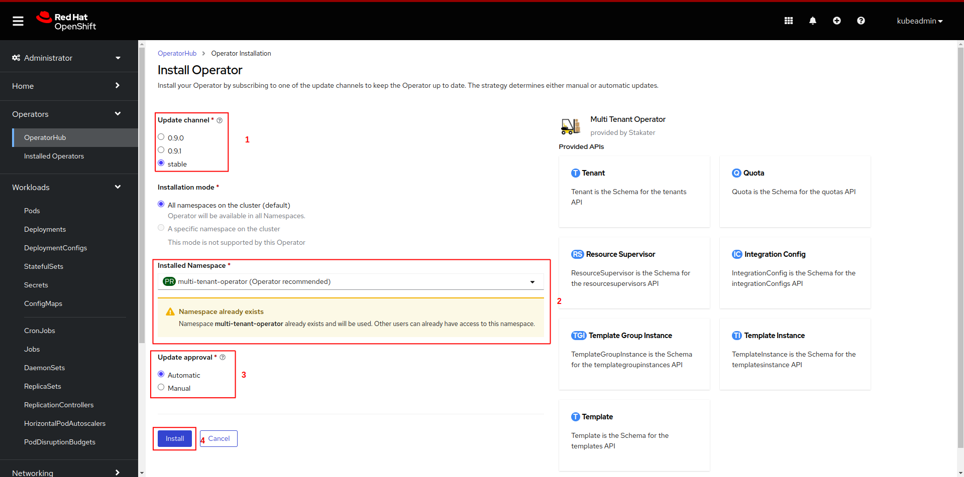 Updated channel. Selectmulti-tenant-operatorto install the operator inmulti-tenant-operatornamespace fromInstalled Namespacedropdown menu. After configuringUpdate approvalclick on theinstallbutton.