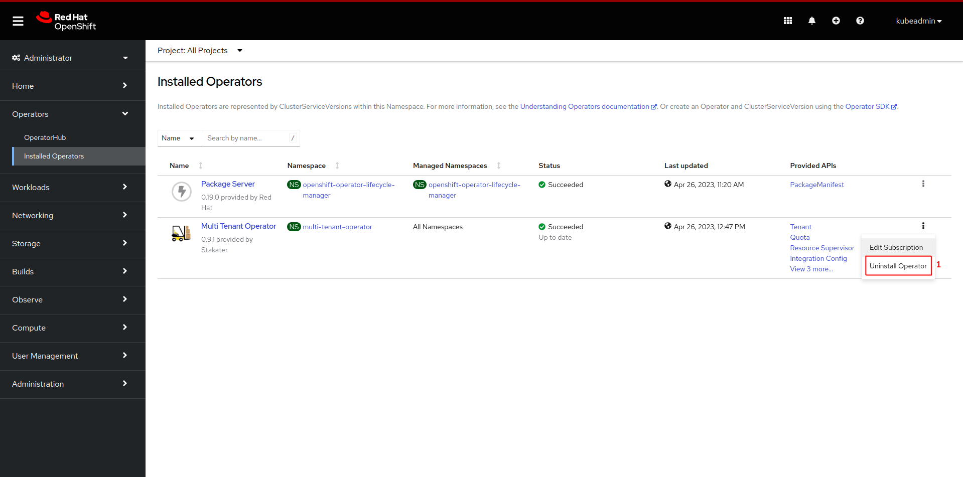 subscriptioncustom resource open OpenShift console and click onOperators, followed byInstalled Operatorsfrom the side menu