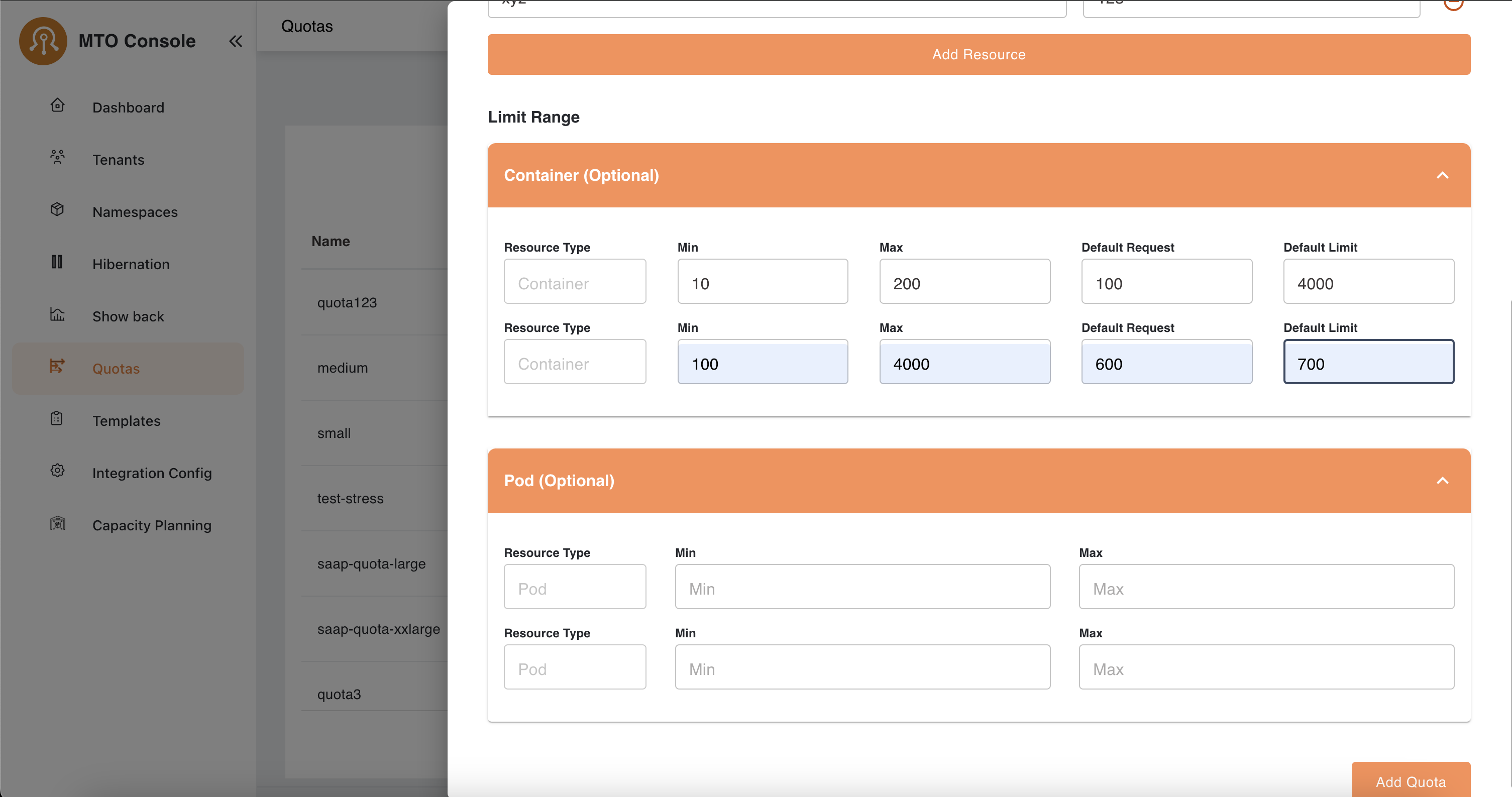 The limit range section provides optional configurations for containers and pods. It includes: