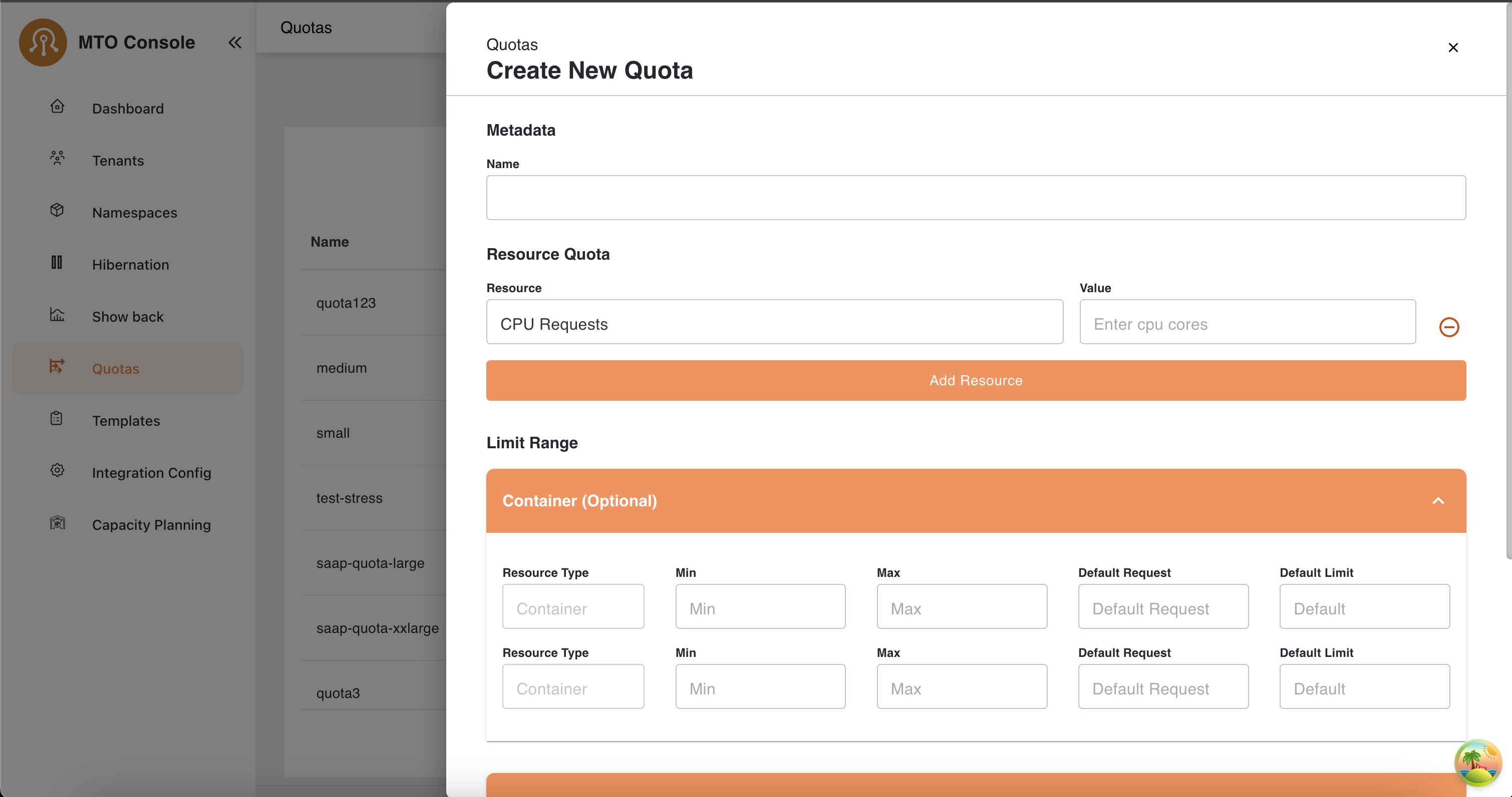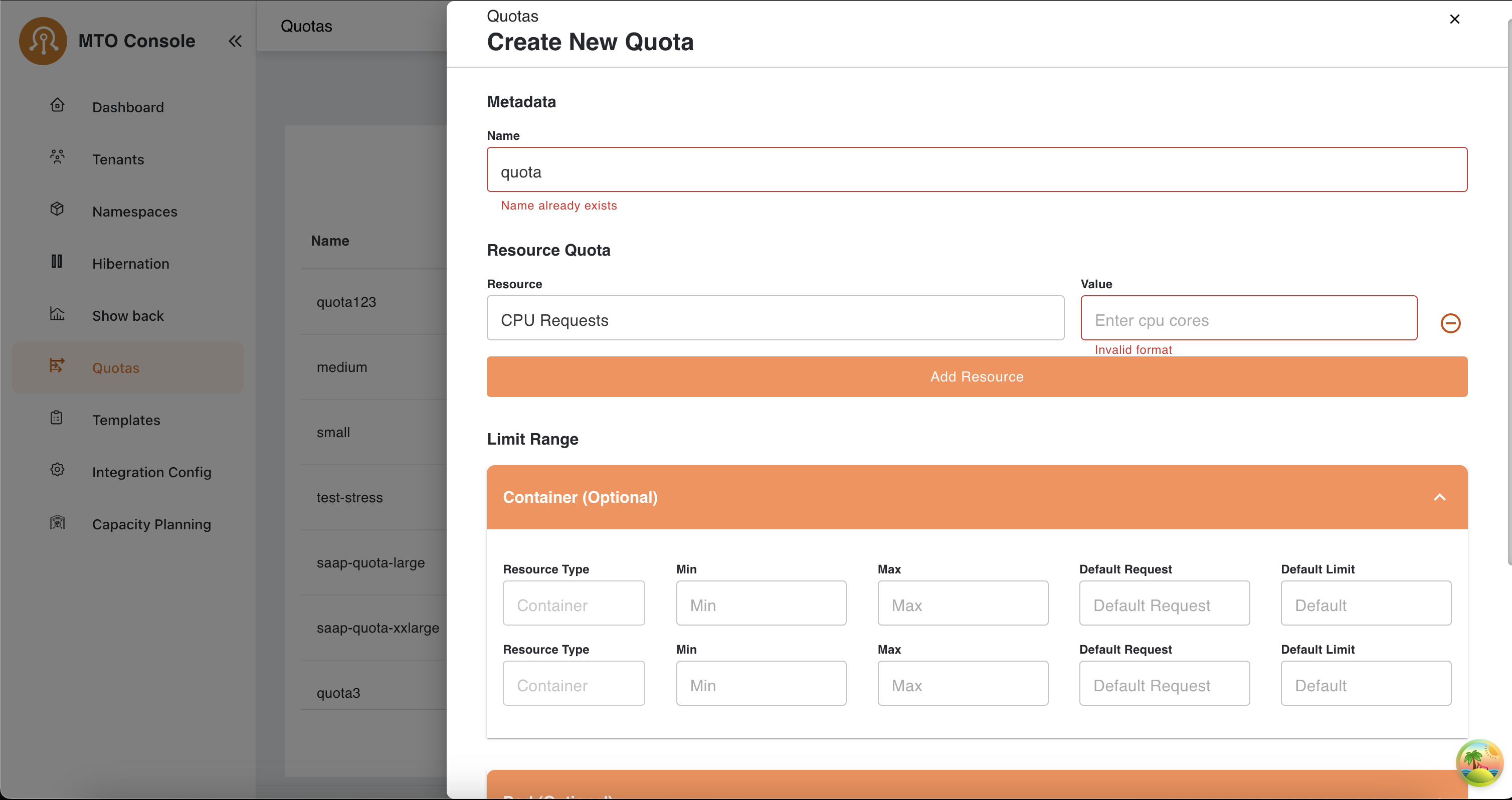 The quota creation process allows administrators to define resource limits and optional configurations for containers and pods. This document outlines the steps to create a new quota, including the metadata, resource quota, and limit range configurations.