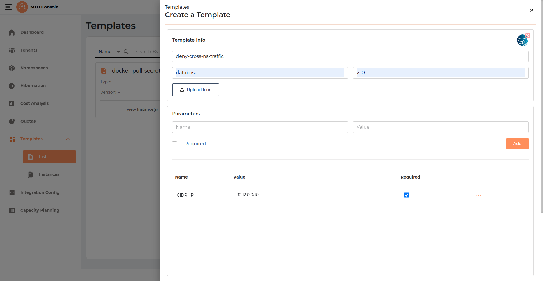 - Required Checkbox: Mark parameters as required if they must be provided when the template is instantiated.