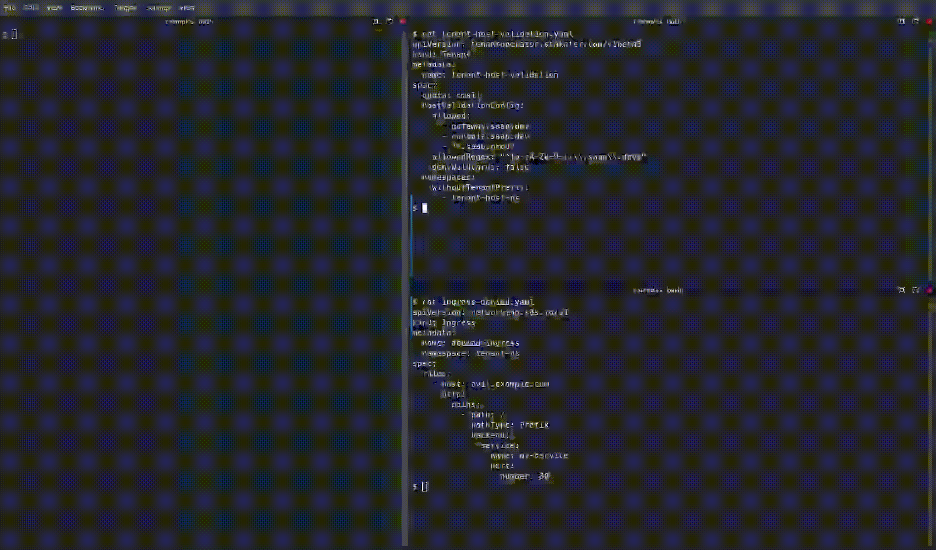 The hostValidationConfig field in the Tenant CR lets you define which hostnames tenants may use when creating Ingress (Kubernetes) or Route (OpenShift) resources.